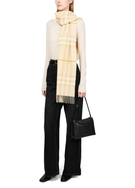 Introducing Burberry's Check cashmere scarf, a timeless accessory adorned with a printed logo and fringed edges. Crafted from the iconic Burberry Check material, this scarf adds a touch of elegance to any ensemble.