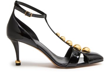 • 설명 : Pumps, logo heel, logo in gold letters, patent leather, stiletto heel, high heel, pointed toe, logo-printed insole, buckled ankle strap.
