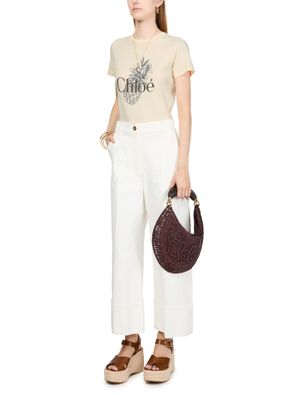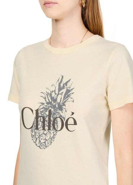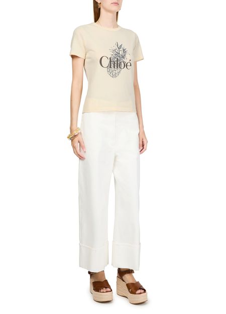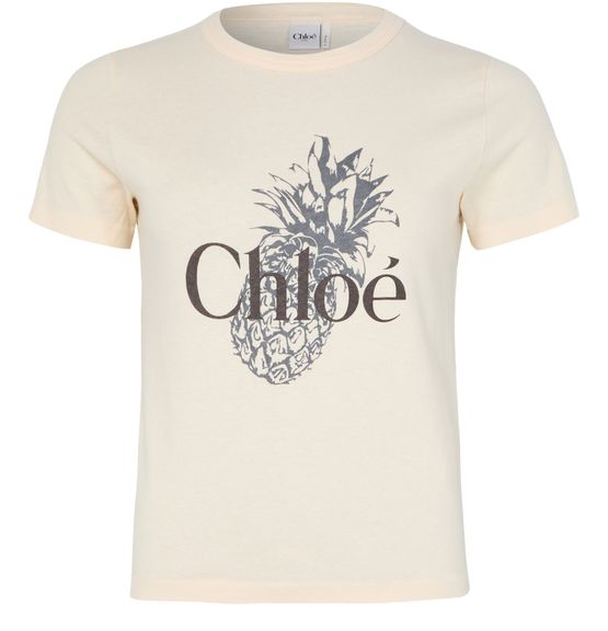 Introducing Chloe's cotton t-shirt, a statement piece for your wardrobe. This slim fit top features a crew neck and short sleeves, completed with a crop length. The front logo adds an artistic touch, making it perfect for casual outings or layered under a jacket for a chic look.