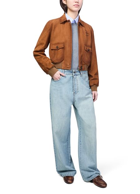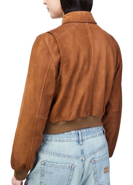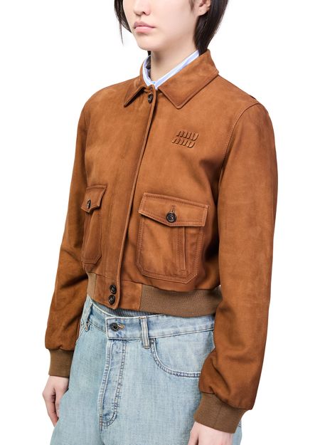 Reimagine Miu Miu's crop suede aviator jacket. This regular fit bomber jacket features a sophisticated button fastening and long sleeves, ensuring a stylish silhouette. Crafted with an embroidered chest logo and flap pockets, it's a versatile piece that transitions seamlessly from casual to formal occasions.