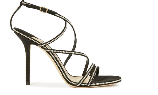 블랙 소프트 스웨이드 소재의 지미추(Jimmy Choo) 뒤데트100(Dudette 100) 샌들입니다. 반짝이는 크리스탈 디테일의 신 플랜지가 돋보이는 스틸레토 힐 샌들입니다.