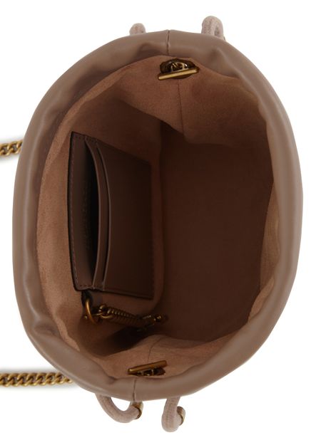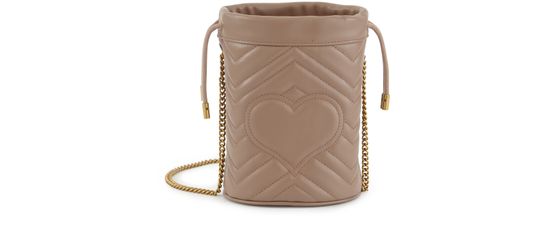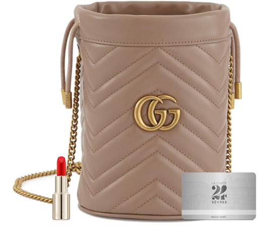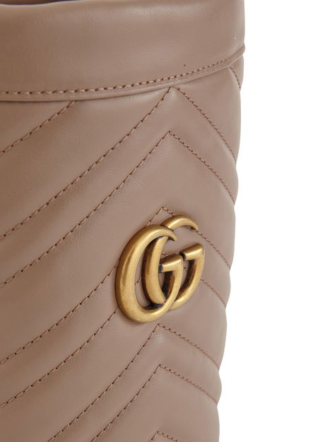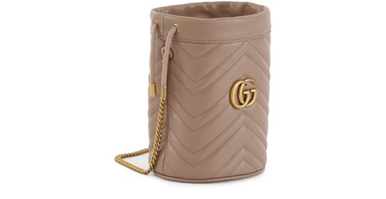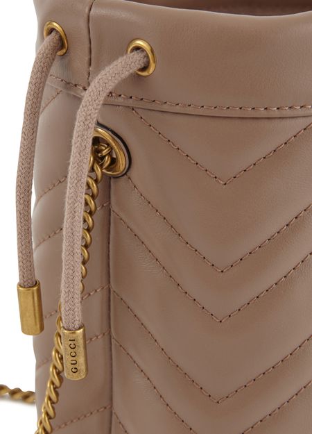 구찌(Gucci) 하우스 로고를 강조하는 텍스처로 만들어진 GG 마몽(Marmont) 버킷 백은 럭셔리 가죽 제품 컬렉션의 일부입니다.