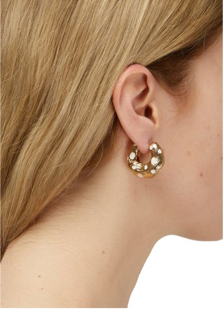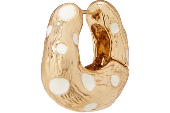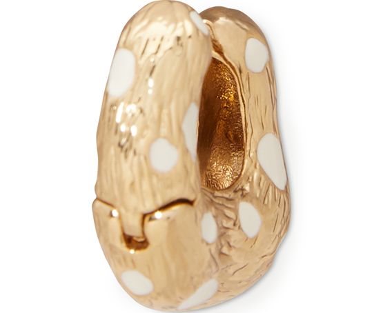 레지나 표(Rejina Pyo)는 레오파드 프린트를 재해석하여 두 가지 소재를 사용한 훕스(Hoops) 이어링을 디자인했습니다. 이 작고 큰 링들은 도금 메탈 소재에 텍스처 피니시를 더해 만들어졌습니다.