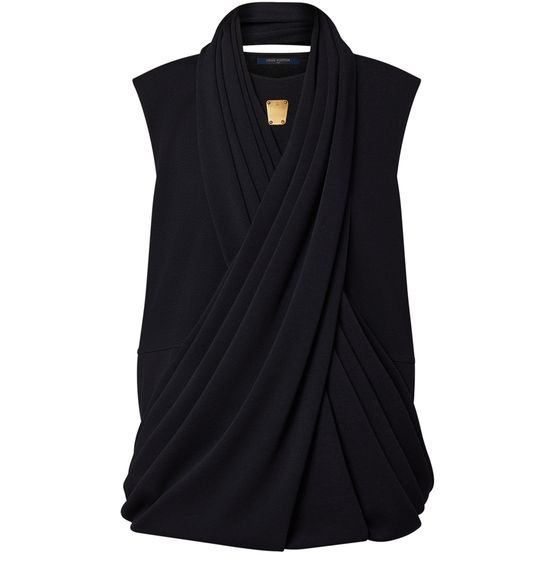 패션쇼에서 선보인 절제된 분위기의 하이브리드 니트 톱. 하단 패널을 루스하게 늘어뜨려 세련되고 현대적으로 스타일링하거나 목 부분에 감아서 우아한 드레이핑을 연출할 수 있는 아이템. 유려한 울 비스코스 혼방 소재. LV 서클을 양각으로 새긴 이번 시즌 특유의 시그니처 명판.