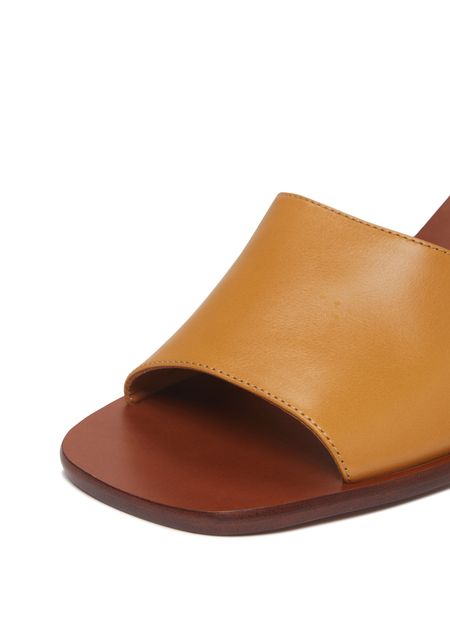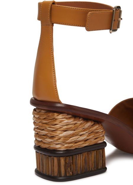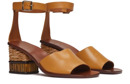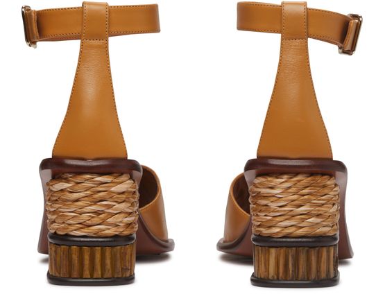 - 설명 : 스퀘어 오픈 토, 스무드 레더, 버클 스트랩, 골드 톤 메탈릭 마감, 로고 인솔, 블록 힐, 위브드 디자인.