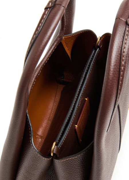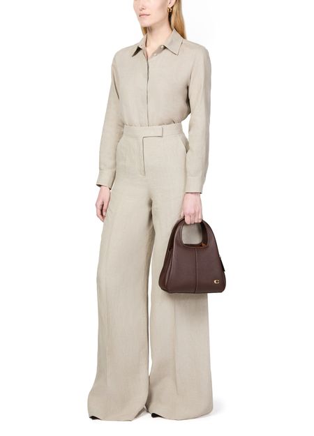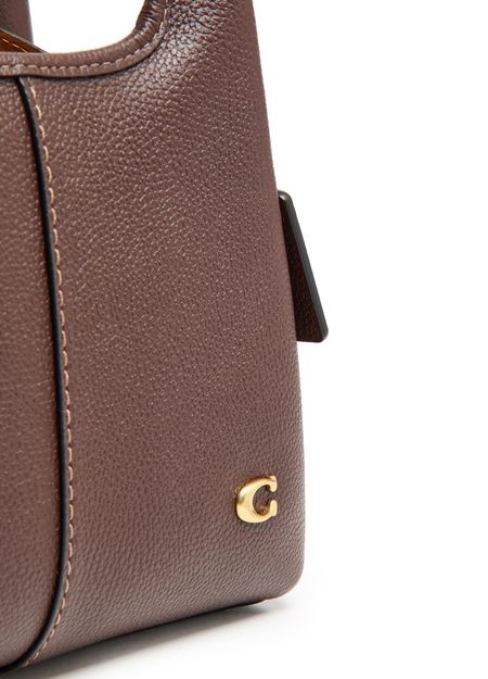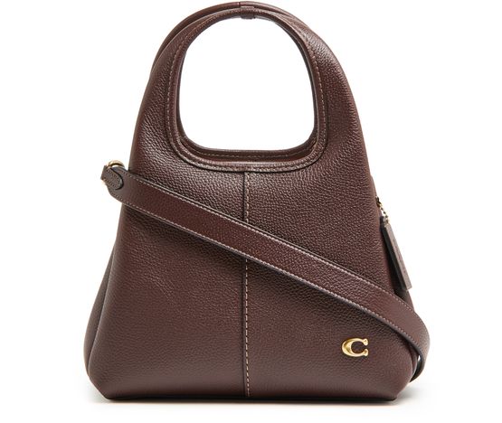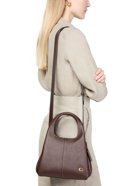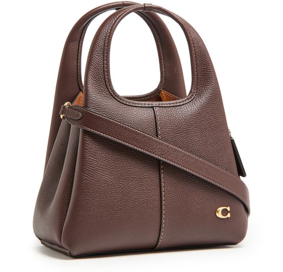 Reveal Coach's Lana 23 polished pebble leather shoulder bag with its chic contrast stitching and elegant gold finish. This versatile tote bag features a logo in gold letters, front logo, and interior slots for your cards. Carry it crossbody, hand-held, or on the shoulder with its adjustable thin strap and double handles.