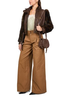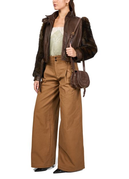 Reveal Chloe's Leather jacket, a masterpiece of design with a slim fit and cropped length, accented by smooth leather and luxurious fur details. The high neck and gold finish add elegance, while the zipper closure ensures practicality. Perfectly versatile for any occasion, this jacket is a must-have.