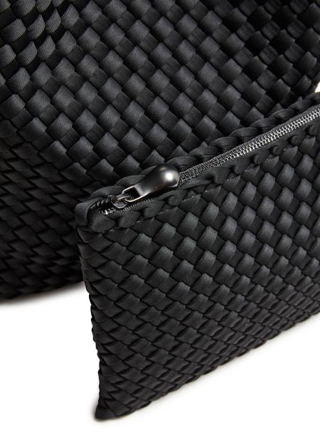 • 설명 : Hobo bag, shoulder bag, single handle, carry handle, embossed logo, open weave, magnetic closure, visible topstitching.