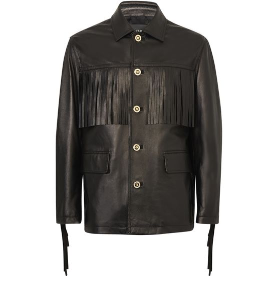 베르사체(Versace)가 피코(Peacot) 재킷을 선보입니다. 소매와 앞쪽에 프린지가 달린 블랙 레더 소재의 이 재킷은 굉장히 락적인 무드를 연출해줍니다. 골드 버튼이 베르사체 특유의 과감한 터치를 더해줍니다. 이 쇼 피스를 프린트 티셔츠와 워싱 진, 버클 부츠에 매치해보세요.