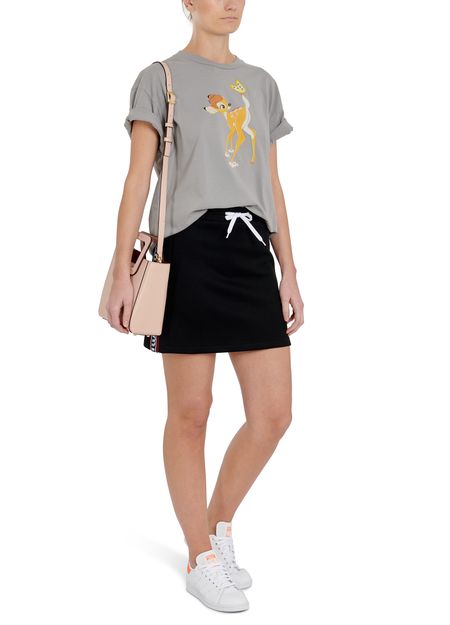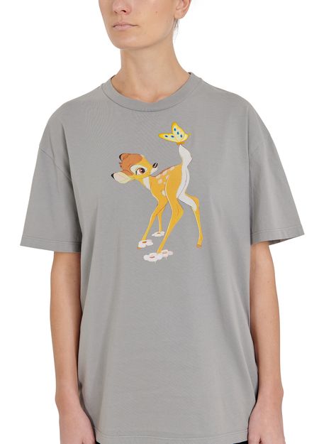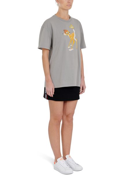 디즈니의 유명하고도 굉장히 눈물겨운 사슴 캐릭터가 미우미우(Miu Miu)의 밤비(Bambi) 프린트 티셔츠에 새겨져 있어, 로맨틱하고 감성적인 룩을 연출해줍니다.