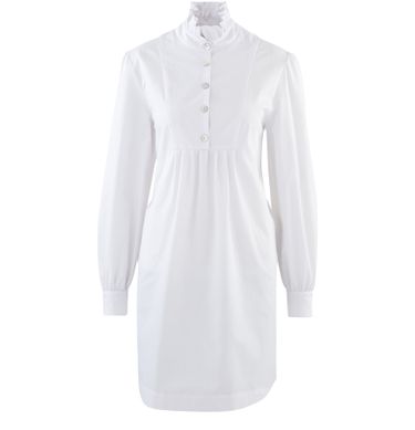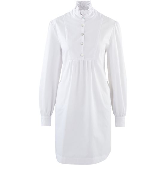 알렉사 청(Alexa Chung)이 디자인한 셔츠 드레스는 살짝 주름이 잡힌 넉넉한 쉐입으로, 버튼이 달린 하이넥 칼라와 자수 러플이 상체를 장식하고 있습니다.