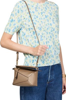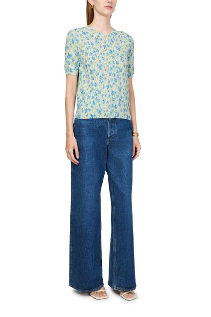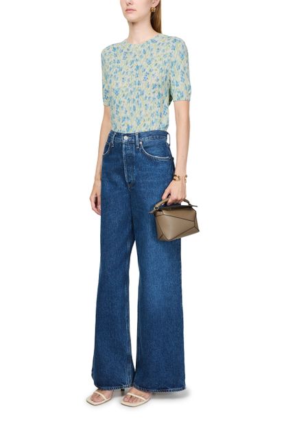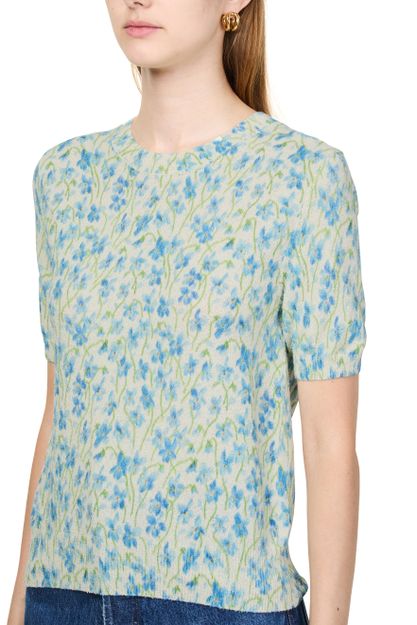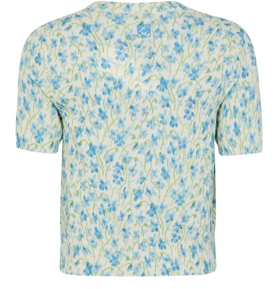 Introducing Loewe's short sleeve sweater. Crafted with a ribbed texture, this regular fit top features a crew neck and short sleeves for a contemporary silhouette. The all-over floral print adds a vibrant touch, while visible stitching enhances its modern appeal. Perfect for pairing with your favorite high-waisted jeans.