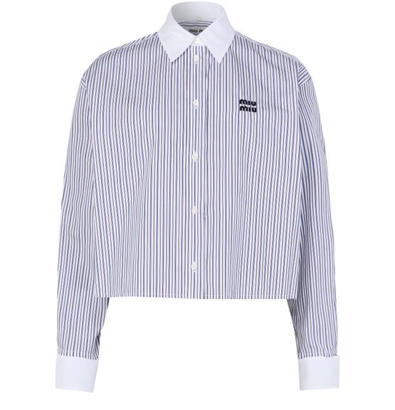 Introducing Miu Miu's striped shirt, designed with a trendy boxy fit and stylish cuffed sleeves. Its button fastening and embroidered "Miu Miu" logo add sophisticated touches to this long-sleeved top. The crop length and striped print ensure a contemporary look, perfect for pairing with high-waisted jeans or skirts.