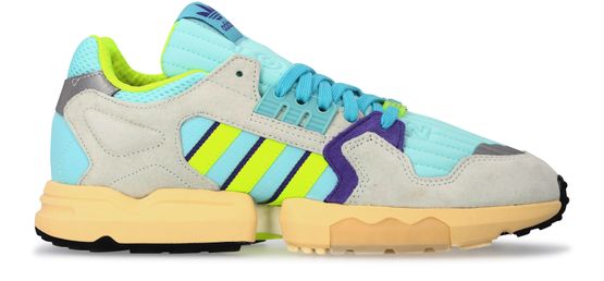 80년대 풍의 아디다스 ZX 토션 스니커즈입니다. 메시 퀼팅과 리플렉티브 밴드, 네온 색상 스웨이드 패널로 구성됩니다.