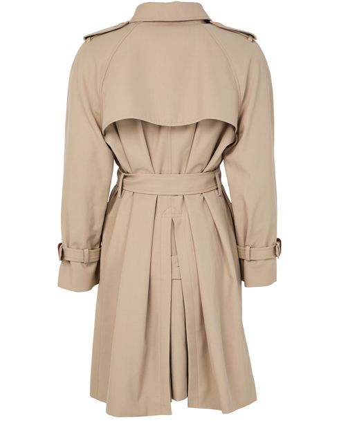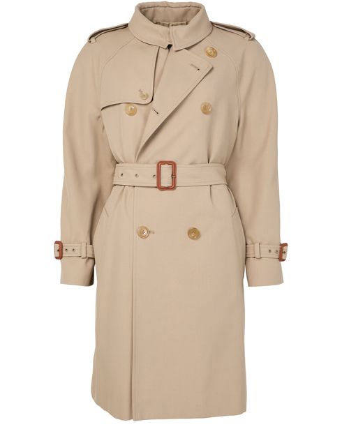 Reveal Celine's Trench coat in cotton and wool gabardine, featuring a classic fit with a notch collar, and raglan sleeves. This elegant piece boasts two welt pockets, gun flaps, and shoulder tabs, complemented by Celine paris-engraved horn buttons and a leather-buckled belt.