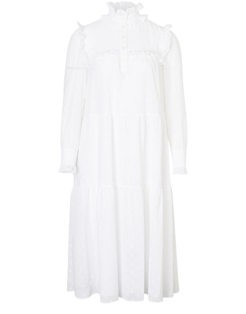 여성스러움을 강조한 셀린느(Celine)의 프릴 미디 드레스입니다. 순면 소재이며 앵클부츠에 매치하여 복고풍 스타일로 연출할 수 있습니다.