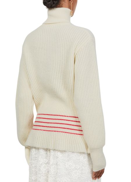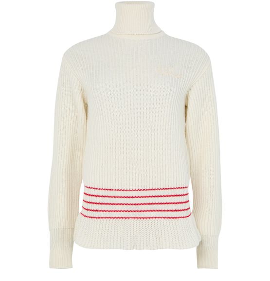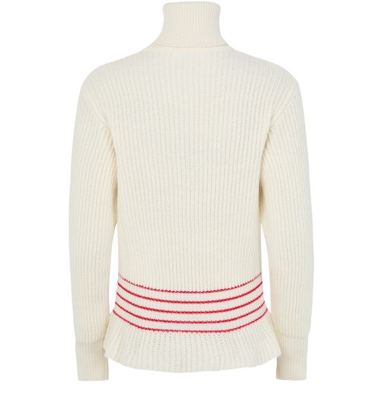 Introducing Chloe's turtleneck sweater, a masterpiece in knitwear with elegant ruffle details. The ribbed texture and striped print define its modern aesthetic. This long-sleeved piece features cuffed sleeves and a regular fit, perfect for elevating any look with ease.