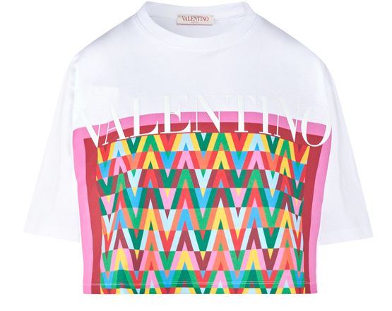 발렌티노(Valentino) 프린트 크롭 티셔츠는 루즈한 핏과 전면에 사용된 생동감 넘치는 멀티 컬러 패턴의 기하학적 무늬가 매력적입니다. 쇼트 슬리브와 라운드 넥 디테일이 여성들의 마음을 사로잡을 거에요.