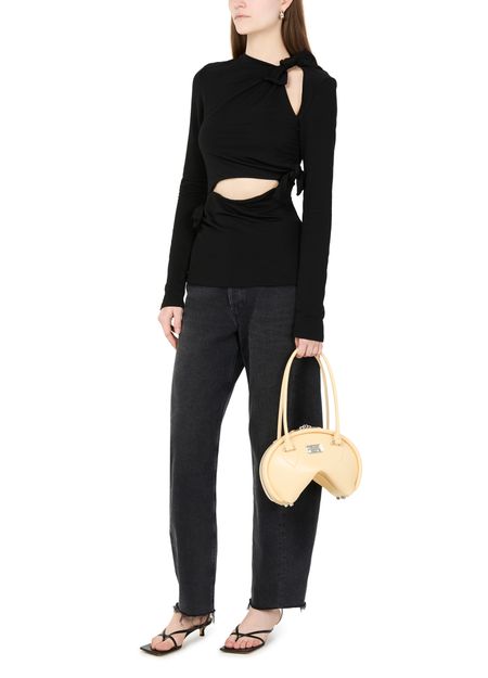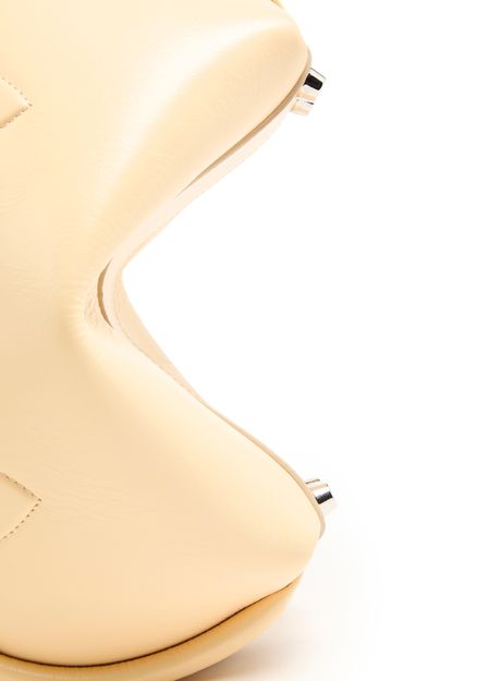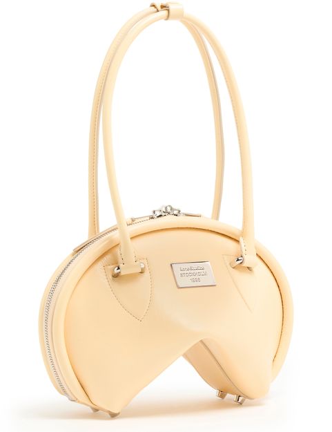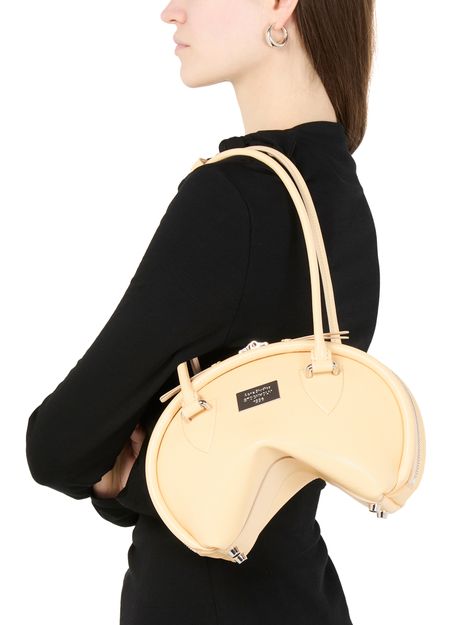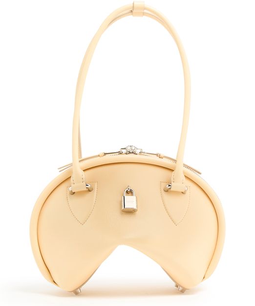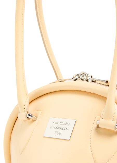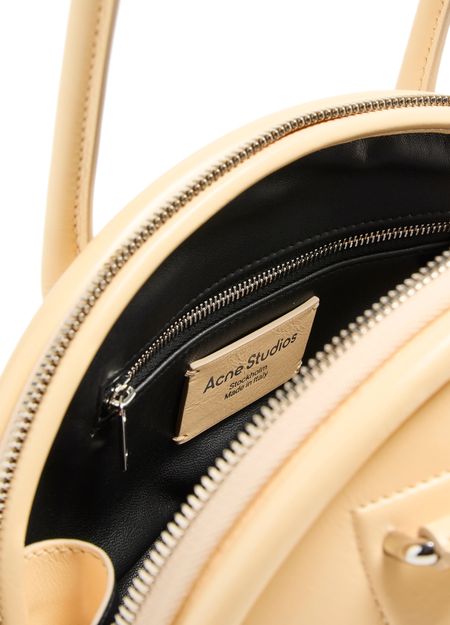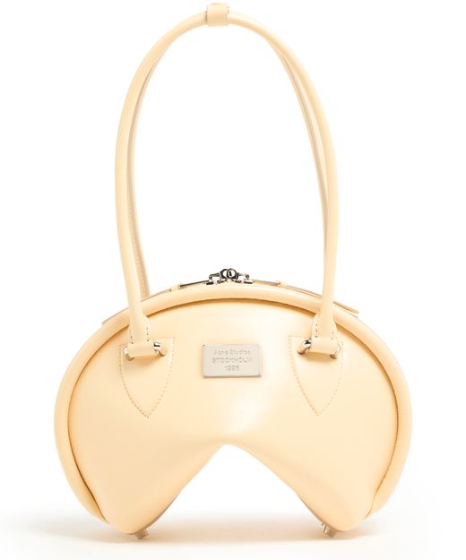Reveal Acne Studios's Bowlina hand-held bag, a masterpiece of modern design. Featuring a silver finish and zipper closure, this bag showcases double handles, a front logo, and a zippered interior pocket. Its visible topstitching adds elegance, while the thin strap allows it to be worn on the shoulder.