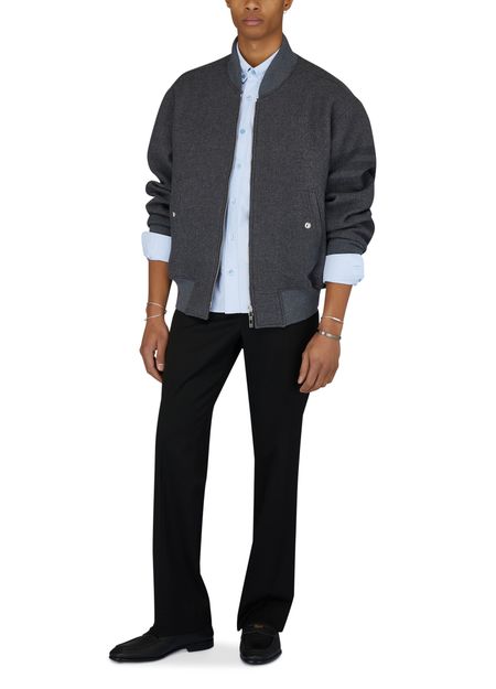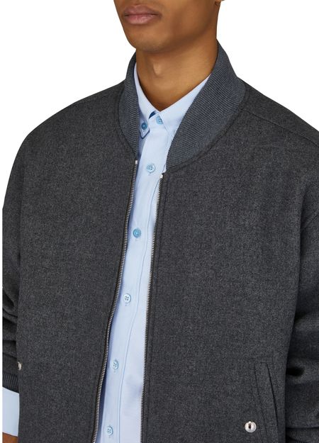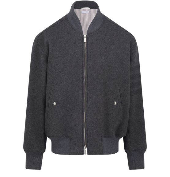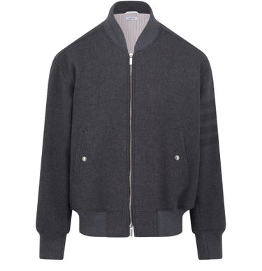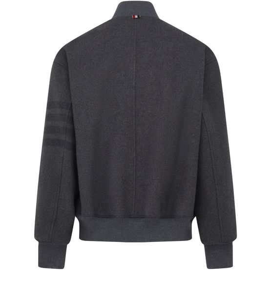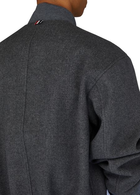 于衣袖处装饰有 Thom Browne 品牌经典标志的这款 4-Bar 外套, 选用略微宽松的超大尺寸线条,搭配拉链闭合及按扣衣袋的时尚设计。