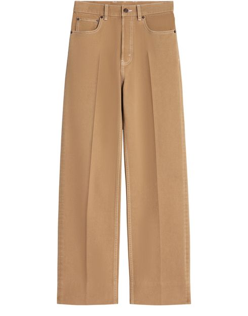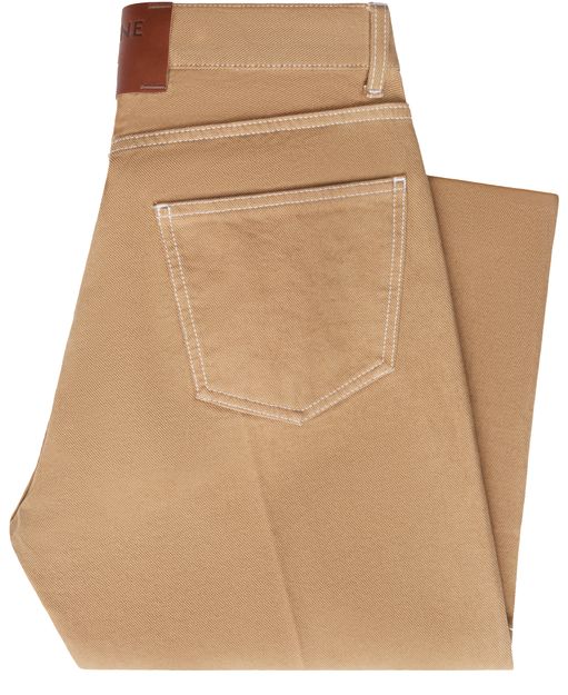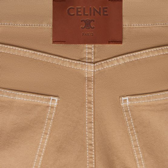 Discover the 002 boyfriend jeans in cotton denim, classic-fit jeans by Celine, with a high waist and straight cut. Featuring five pockets and rivets on the front, these jeans combine style and functionality. The Celine Paris Triomphe leather patch at the back and the engraved 'Celine jeans' buttons add a refined touch.