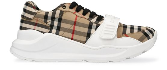 Burberry 推出的此款低帮运动鞋,在运用著名格子呢纹与对比色斜条饰带装点鞋面的同时,再现运动衣橱经典款式的时尚设计风格。