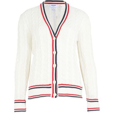 作为经典单品的此款针织开衫,在其由 Thom Browne 品牌签名的三色条纹饰边的映衬下,更显时尚经典气息。 修身的剪裁尽显身形曲线。