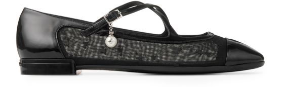 Introducing Jimmy Choo's Eleri ballerinas in soft spazzolato leather. These elegant ballet pumps feature a closed square toe and a flat heel for ultimate comfort. The patent leather and open weave fishnet design adds a touch of sophistication, while the pearl-embellished buckled strap and visible stitching ensure a standout look.