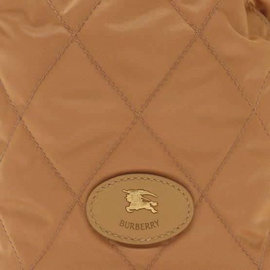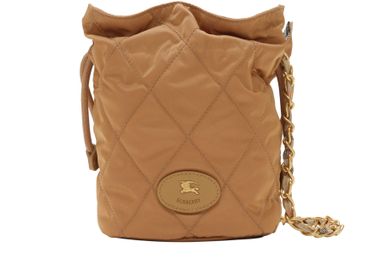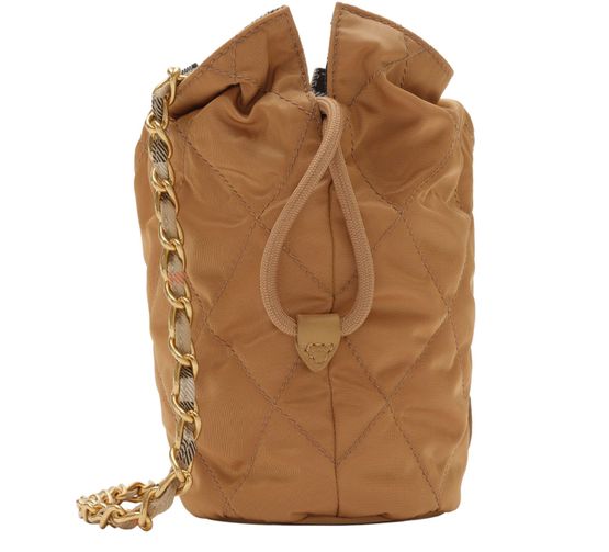 Reveal Burberry's small bucket bag, a statement piece defined by its chevron pattern and gold finish. The chain strap and drawstring closure add modern flair, while the Knight Design equestrian emblem and front logo showcase signature craftsmanship. Visible topstitching and padded texture complete this refined silhouette.