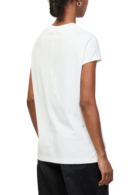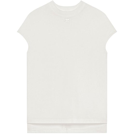 Reveal Courreges's oversized t-shirt, defined by its crew neck and cap sleeves for a modern silhouette. The short-sleeved design offers effortless versatility, pairing seamlessly with both casual and elevated looks. Its relaxed fit and refined details make this top a standout for any contemporary wardrobe.