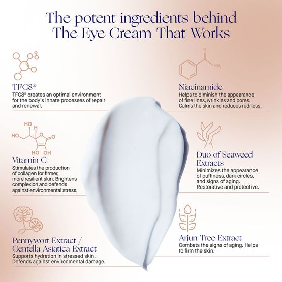 它蕴含我们独特的 TFC8® 科技——即我们专利所有的氨基酸、高级维生素和合成分子混合物,可为皮肤供应重要营养成分并支持身体的内在更新循环——并结合法国海藻、积雪草和阿江榄仁树提取物的卓越混合物(以其清爽焕活这一脆弱区域的功效而著称),还有烟酰胺和维生素 C 以帮助淡化细纹和皱纹痕迹,以及重要的抗氧化剂来防止蓝光照射带来的眼周损害。 令肌肤得到舒缓,并显著带来清爽和焕采之感。