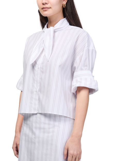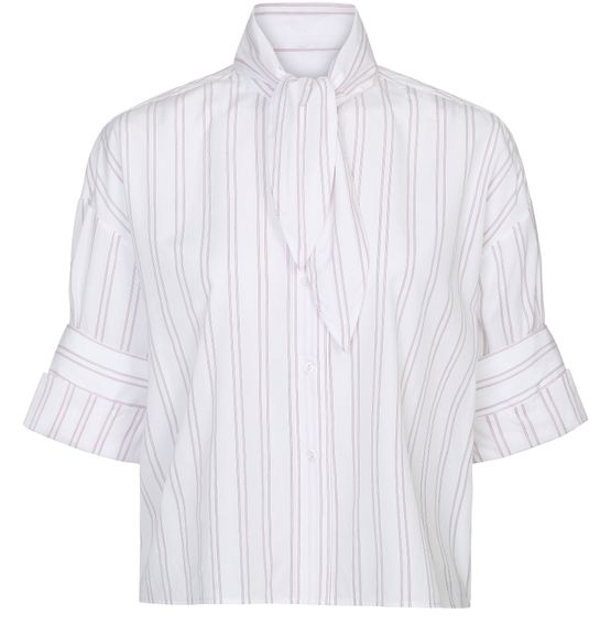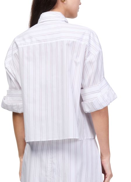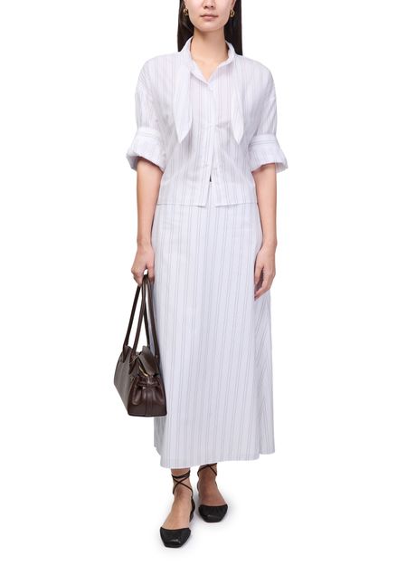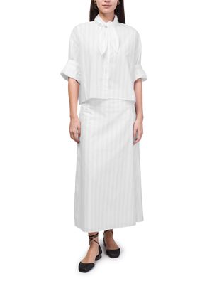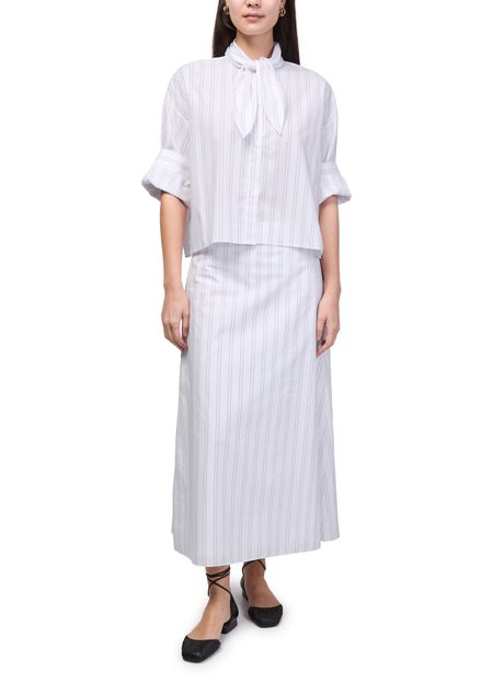 Reveal TWP's Tie One On striped shirt, a modern top featuring a high-neck and short, cuffed sleeves. The front buttoned closure and crisp striped print create a refined silhouette, making it a versatile choice for both casual and elevated looks.