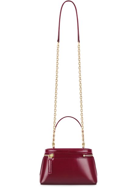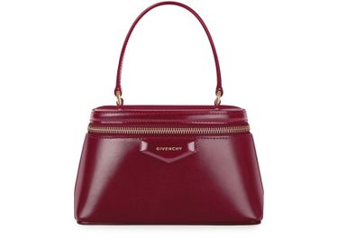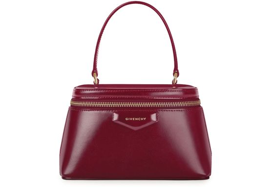 Reveal Givenchy's Antigona leather vanity case, crafted from smooth leather with a refined gold finish. The front logo in gold letters and visible stitching highlight its signature style, while the single handle and zipper closure offer both elegance and practicality in a compact mini bag design.