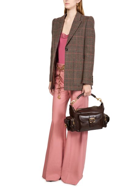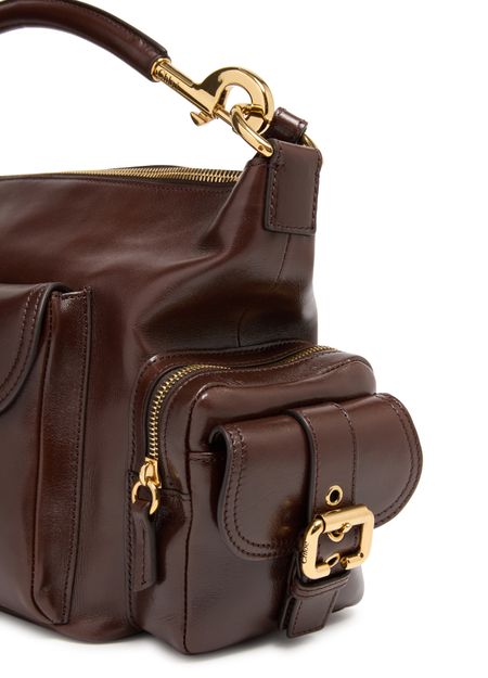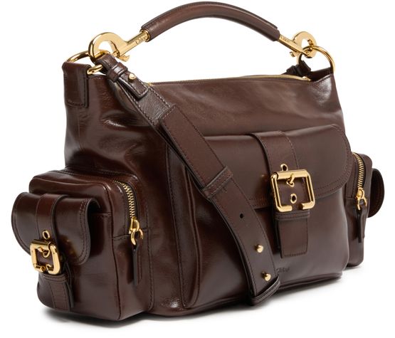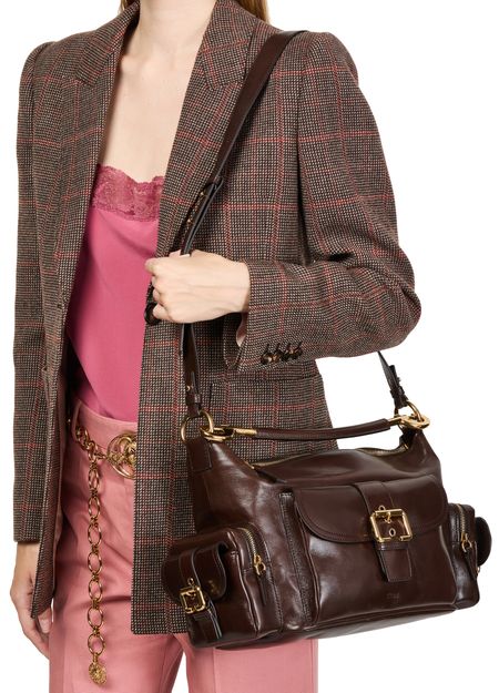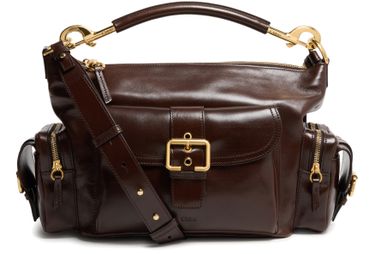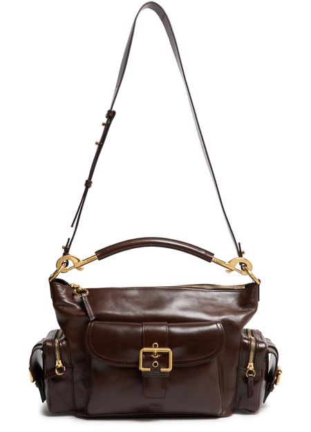Chloé's Camera bag showcases a sleek design with a zipper closure and a single compartment for essentials. Its gold finish adds a touch of elegance, complemented by double handles and visible topstitching. With interior patch pockets, it can be hand carried or worn crossbody using the detachable thin strap.
