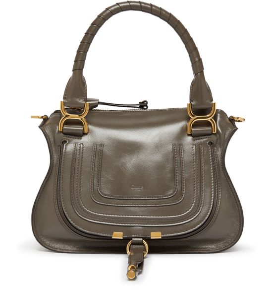 Chloé's Marcie small double worn glossy leather bag visible topstitching and a front logo, exuding elegance. With a zipper closure and single compartment, this mini bag is versatile. Its gold finish complements the double handles and thin strap, allowing it to be hand carried or worn crossbody for effortless style.