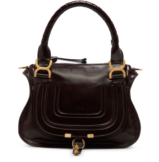 Chloé's Marcie small double worn glossy leather bag visible topstitching and a front logo, exuding elegance. With a zipper closure and single compartment, this mini bag is versatile. Its gold finish complements the double handles and thin strap, allowing it to be hand carried or worn crossbody for effortless style.