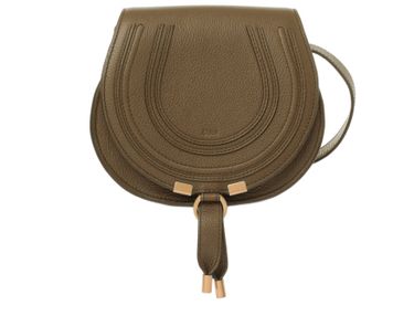 Chloé's Marcie small glossy leather shoulder bag features a front logo and engraved logo, visible topstitching, thin strap for wearing crossbody, single handle with gold finish, single compartment with flap closure, front pocket, and leather handle.