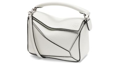 Loewe 系列经典单品—— Puzzle 手提包选用迷你款型。 其保留了令包款设计享有盛誉的不对成剪裁。