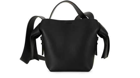 Acne's Musubi mini bag is a versatile accessory with an adjustable, detachable strap for various carrying options. It can be hand carried, worn on the shoulder, or across the body. The bag features a handle on the back and a zippered interior pocket for organization.