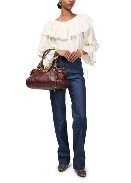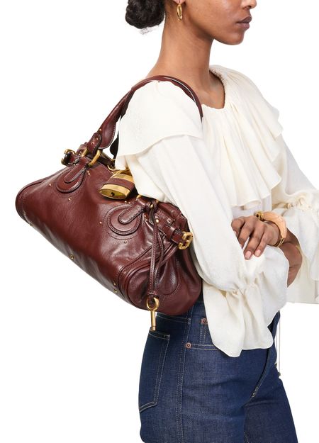Reveal Chloe's Paddington handbag, crafted from smooth leather with signature saddle stitch and contrast stitching. Double handles and a gold clasp add refined appeal, while a zippered interior pocket and large compartment ensure practical elegance. The engraved front logo and gold finish complete this sophisticated shoulder bag.