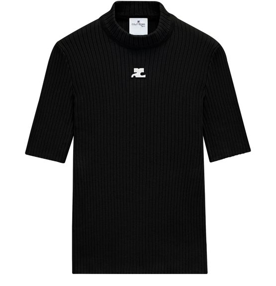 Reveal Courreges's ribbed mockneck knit top, featuring a refined short-sleeved silhouette and an embroidered chest logo. The textured finish and modern neckline offer a sleek look, making this piece a versatile addition for layering or standalone styling in any contemporary wardrobe.