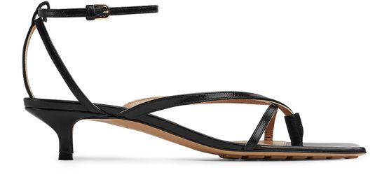 Bottega Veneta's stretch strap sandals feature a stiletto heel and very thin sole, providing a sleek and elegant look. The buckled ankle strap ensures a secure fit, while the square toe adds a contemporary touch. These sandals are the perfect combination of style and sophistication for any occasion.
