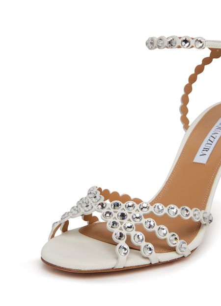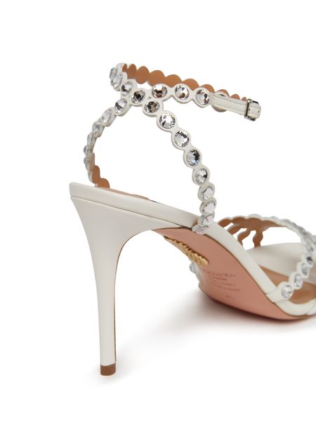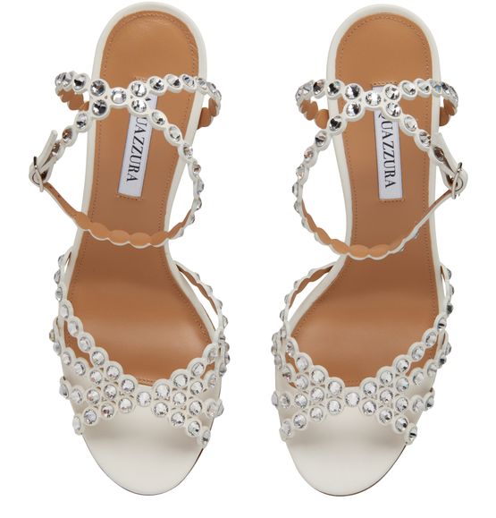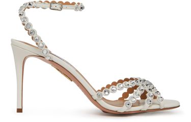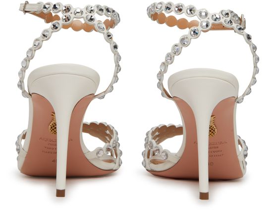 Aquazzura's Tequila 85 sandals feature an open round toe design, perfect for showing off a fresh pedicure. These stylish sandals are adorned with eye-catching embellishments, adding a touch of glamour to any outfit. The buckled ankle strap provides a secure fit, while the stiletto heel adds a hint of sophistication.
