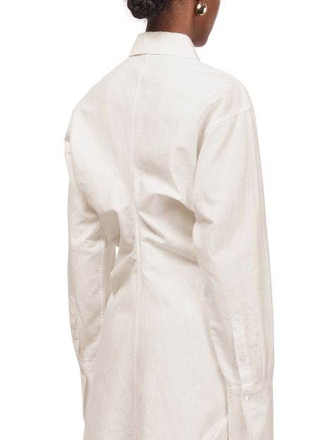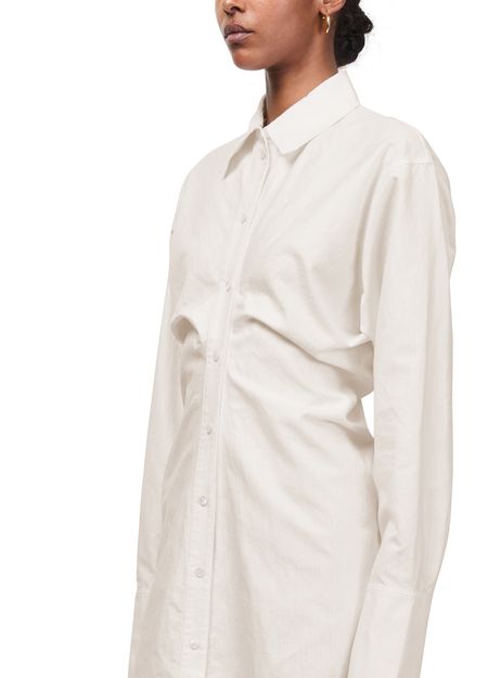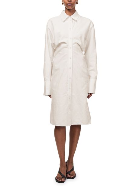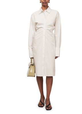 Reveal Toteme's long-sleeved shirt dress, a knee-length silhouette defined by its tailored collar and cuffed sleeves. The front buttoned closure adds a refined touch, while the structured design ensures effortless sophistication for both work and weekend occasions.