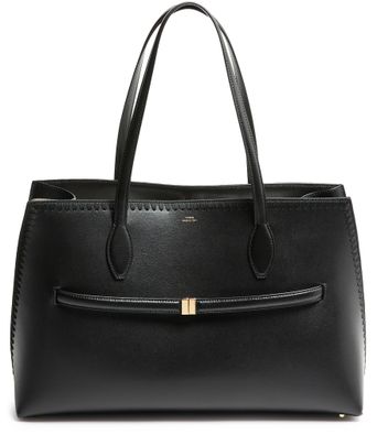 Reveal Toteme's embroidered leather lounge tote bag, a masterpiece crafted from smooth leather with elegant metal finishes. The gold clasp and double handles offer both style and functionality. Embrace the visible topstitching and iconic front logo, which add a touch of sophistication to any ensemble.