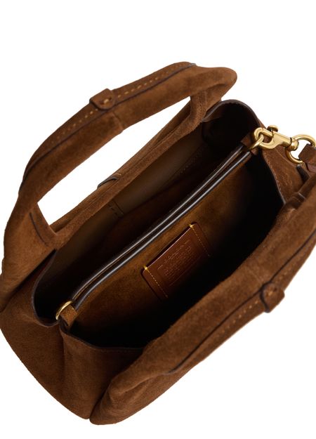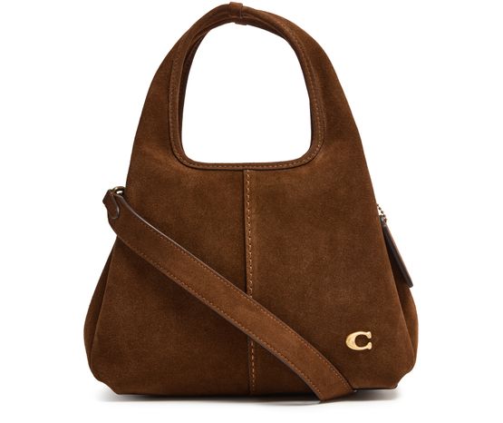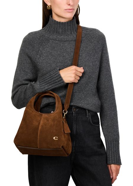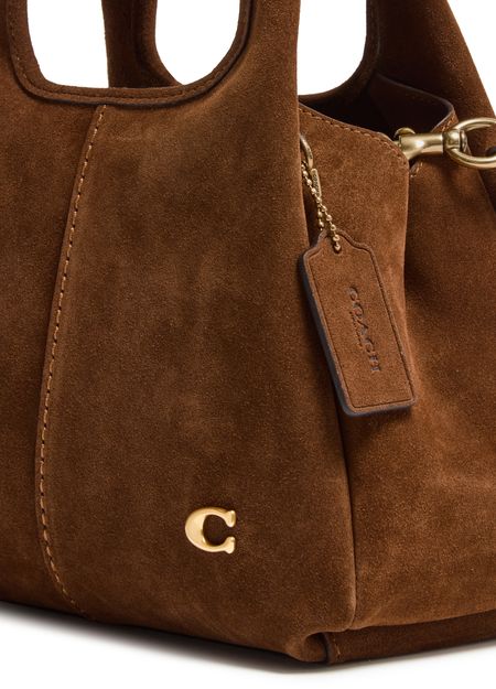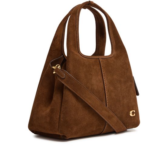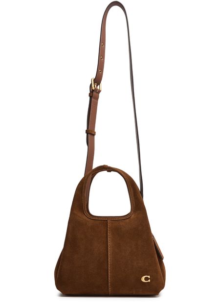 Reveal Coach's Lana 23 shoulder bag, a masterpiece of modern design. Crafted from luxurious suede, it features a decorative 'C' detail and a detachable thin strap for versatile styling. The interior pocket and contrast stitching add functional elegance, while the gold finish and front logo complete its sophisticated allure.