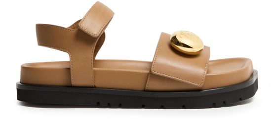 Introducing Loewe's Pebble fussbett sandals in soft calfskin. These elegant sandals offer an open, round toe design with a Velcro fastening and a flat heel for ultimate comfort. Crafted from smooth leather, they feature a contrasting sole and a sophisticated engraved logo with gold finishes.