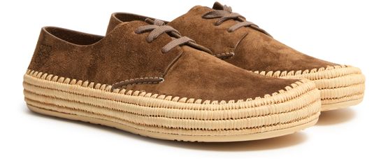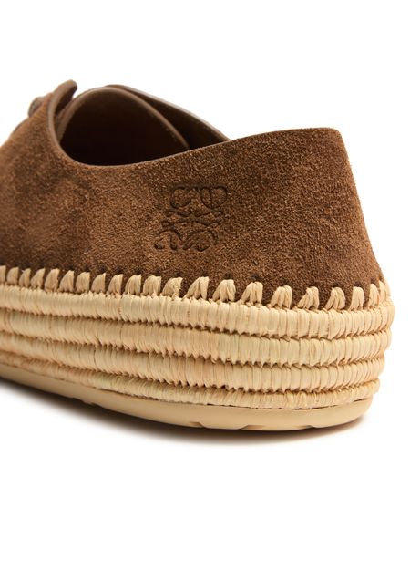Unveil Loewe's Rio lace up espadrilles in suede and raffia, where classic design meets modern elegance. These espadrilles feature a round toe and flat heel, offering comfort with every step. The laces and strap closure ensure a secure fit, while the embroidered logo and visible stitching add a touch of refinement.