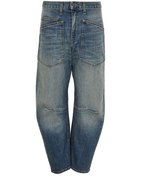 Introducing Nili Lotan's Shon straight leg jeans, crafted from premium faded denim for a modern touch. These high-waisted jeans feature a buttoned zipper closure, ankle length, and visible stitching. The back patch pocket and belt loops enhance functionality, making them perfect for any wardrobe.