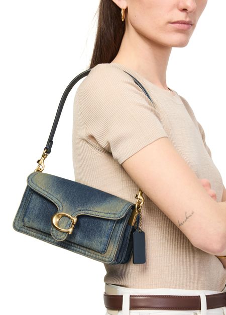 Reveal Coach's Tabby 20 denim shoulder bag, crafted from faded denim with a magnetic 'C' buckle and gold finish. The adjustable, detachable thin strap and single handle offer versatile styling, while the metallic logo and visible topstitching highlight Coach's signature craftsmanship and modern appeal.